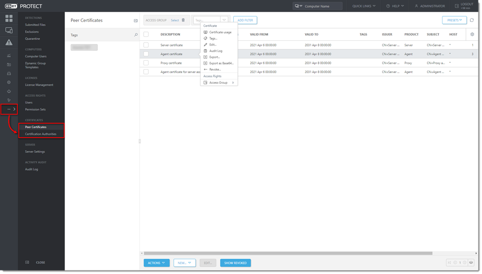 Exporting a certificate or public key from ESET PROTECT involves saving a copy of the digital certificate or public key to a file on the local machine or a removable storage device. This can be used to transfer the certificate or public key to another system or to store it for later use.